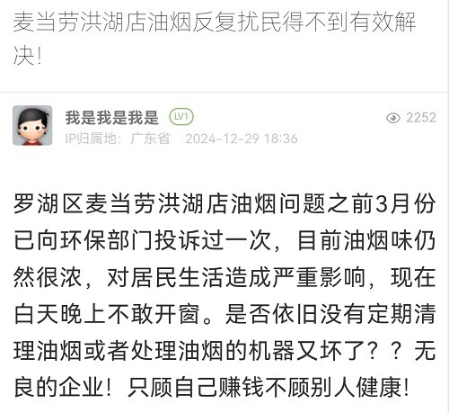 19. 帖文《麦当劳洪湖店油烟反复扰民得不到有效解决!》