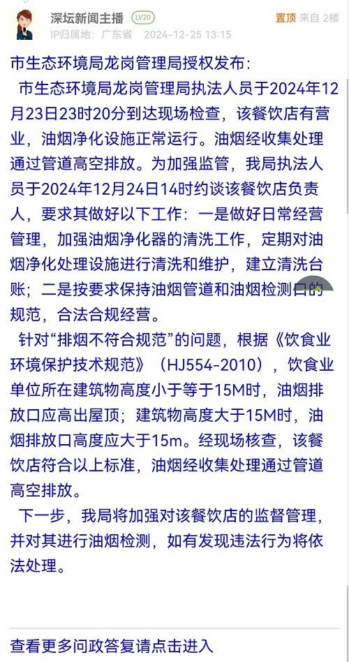 市生态环境局龙岗管理局执法人员于2024年12月23日23时20分到达现场检查,该餐饮店有营业,油烟净化设施正常运行。油烟经收集处理通过管道高空排放。为加强监管,我局执法人员于2024年12月24日14时约谈该餐饮店负责人,要求其做好以下工作:一是做好日常经营管理,加强油烟净化器的清洗工作,定期对油烟净化处理设施进行清洗和维护,建立清洗台账;二是按要求保持油烟管道和油烟检测口的规范,合法合规经营。