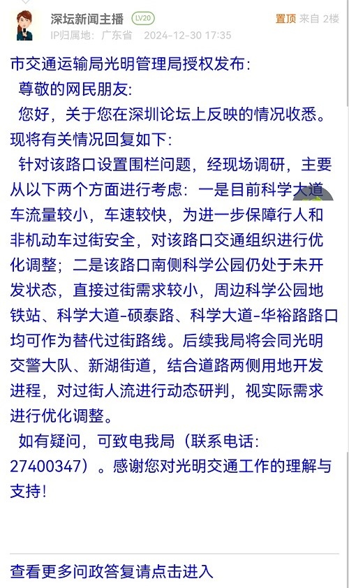针对该路口设置围栏问题,经现场调研,主要从以下两个方面进行考虑:一是目前科学大道车流量较小,车速较快,为进一步保障行人和非机动车过街安全,对该路口交通组织进行优化调整;二是该路口南侧科学公园仍处于未开发状态,直接过街需求较小,周边科学公园地铁站、科学大道-硕泰路、科学大道-华裕路路口均可作为替代过街路线。后续我局将会同光明交警大队、新湖街道,结合道路两侧用地开发进程,对过街人流进行动态研判,视实际需求进行优化调整。