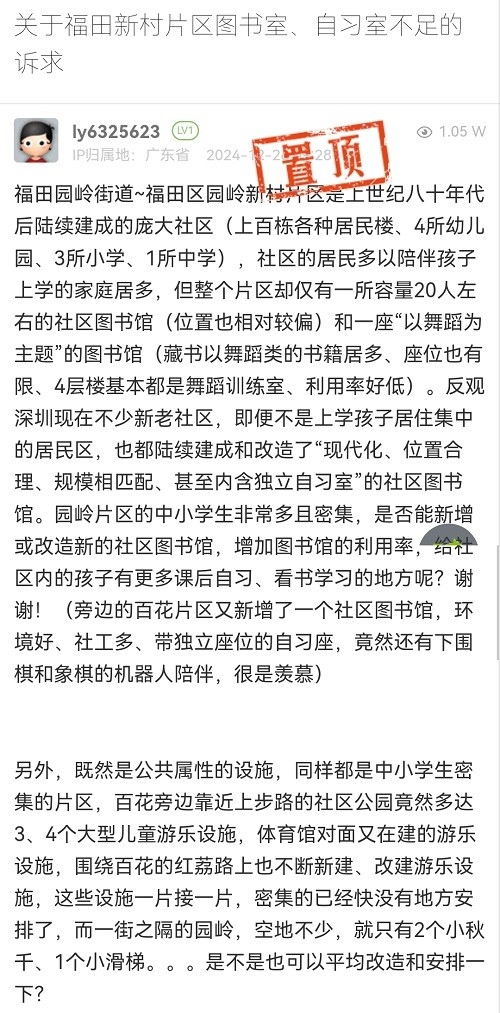 12. 帖文《关于福田新村片区图书室、自习室不足的诉求》