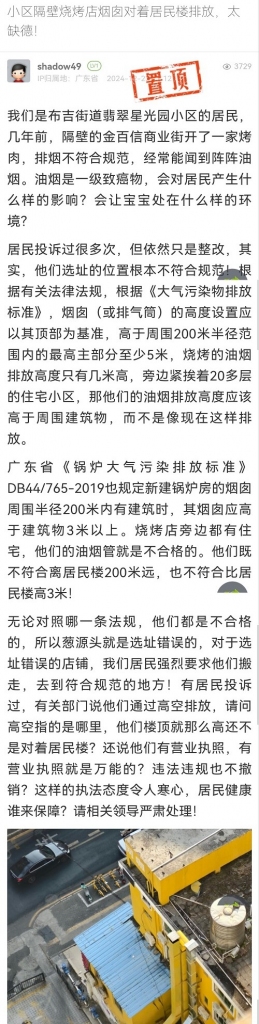 4. 帖文《小区隔壁烧烤店烟囱对着居民楼排放,太缺德!》