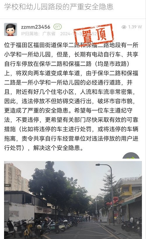 1. 帖文《学校和幼儿园路段的严重安全隐患》
