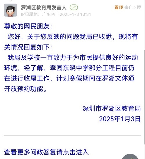我局及学校一直致力于为市民提供良好的运动环境,经了解,翠园东晓中学部分工程目前仍在进行收尾工作,计划寒假期间在罗湖文体通开放预约功能。