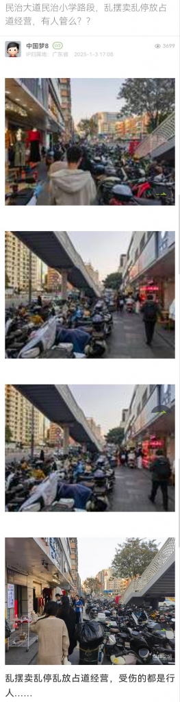 20. 帖文《民治大道民治小学路段,乱摆卖乱停放占道经营,有人管么??》