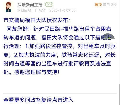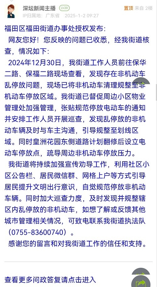 各职能单位如需对网友反映的问题进行回应,可在深圳论坛注册官方账号并通过认证,回帖进行回应。