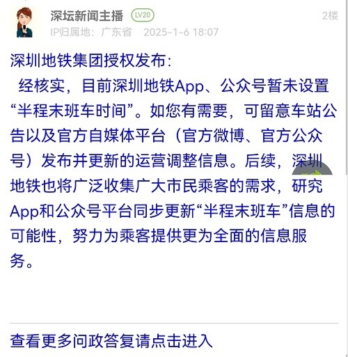 经核实,目前深圳地铁App、公众号暂未设置“半程末班车时间”。如您有需要,可留意车站公告以及官方自媒体平台(官方微博、官方公众号)发布并更新的运营调整信息。后续,深圳地铁也将广泛收集广大市民乘客的需求,研究App和公众号平台同步更新“半程末班车”信息的可能性,努力为乘客提供更为全面的信息服务。