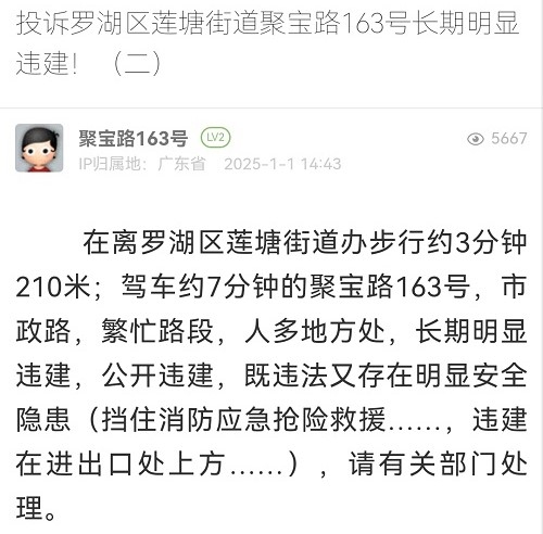 13. 帖文《投诉罗湖区莲塘街道聚宝路163号长期明显违建!(二)》