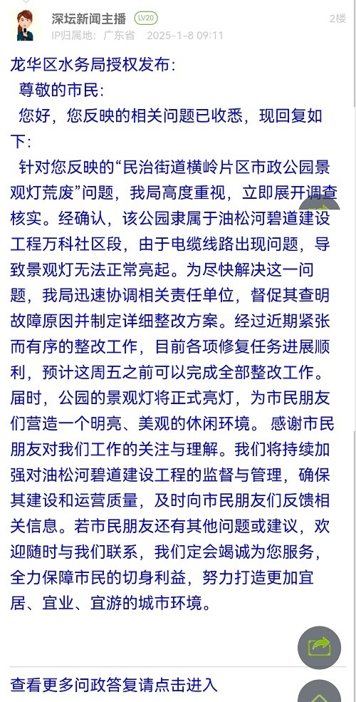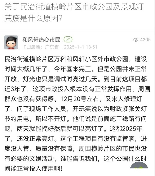 12. 帖文《关于民治街道横岭片区市政公园及景观灯荒废是什么原因?》