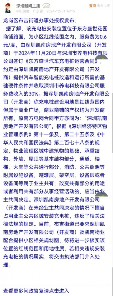 据了解,该充电桩安装位置位于东方盛世花园商铺路面,为小区红线范围之内,服务费为0.6元/度,由深圳凯南房地产开发有限公司(开发商)于2024年11月20日与深圳市养电科技有限公司签订《东方盛世汽车充电桩运营合同》,约定由深圳凯南房地产开发有限公司(开发商)提供汽车智能充电桩改造和运行所需的基础硬件条件并收取深圳市养电科技有限公司服务费收入的30%。据深圳凯南房地产开发有限公司(开发商)称充电桩建设用地是红线范围内但属于商业广场,商业商铺的产权均为开发商所有,原南方电网合同甲方亦同为:“深圳凯南房地产开发有限公司”。根据《深圳经济特区物业管理条例》第十一条及、第二十五条及《中华人民共和国民法典》第二百七十八条的规定,物业管理区域中建筑物的基础、承重结构、外墙、屋顶等基本结构部分,通道、楼梯、大堂等公共通行部分,消防、公共照明等附属设施设备,避难层、架空层、设备层或者设备间等属于业主共有;改变共有部分的用途或者利用共有部分从事经营活动的,应当由业主共同决定。深圳凯南房地产开发有限公司(开发商)在未经业主共同决定的情况下擅自占用业主公共区域安装充电桩,违反了相关法律法规的规定。目前,布吉街道已要求深圳凯南房地产开发有限公司(开发商)及凯南物业配合提供小区相关规划图,待将进一步核实该位置的红线范围和用地性质,若相关违规安装充电桩的情况属实,将交由执法部门介入处理。