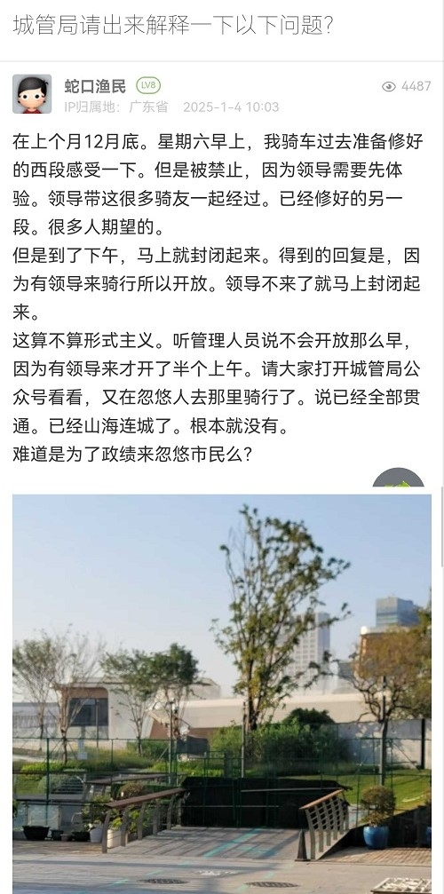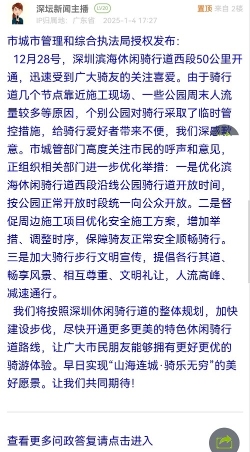 12月28号,深圳滨海休闲骑行道西段50公里开通,迅速受到广大骑友的关注喜爱。由于骑行道几个节点靠近施工现场、一些公园周末人流量较多等原因,个别公园对骑行采取了临时管控措施,给骑行爱好者带来不便,我们深感歉意。市城管部门高度关注市民的呼声和意见,正组织相关部门进一步优化举措:一是优化滨海休闲骑行道西段沿线公园骑行道开放时间,按公园正常开放时段统一向公众开放。二是督促周边施工项目优化安全施工方案,增加举措、调整时序,保障骑友正常安全顺畅骑行。三是加大骑行步行文明宣传,提倡各行其道、畅享风景、相互尊重、文明礼让,人流高峰、减速通行。