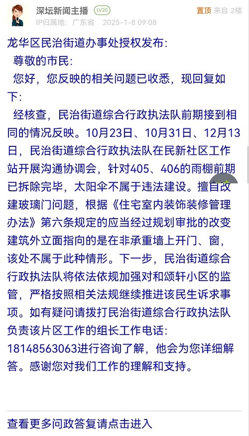 经核查,民治街道综合行政执法队前期接到相同的情况反映。10月23日、10月31日、12月13日,民治街道综合行政执法队在民新社区工作站开展沟通协调会,针对405、406的雨棚前期已拆除完毕,太阳伞不属于违法建设。擅自改建玻璃门问题,根据《住宅室内装饰装修管理办法》第六条规定的应当经过规划审批的改变建筑外立面指向的是在非承重墙上开门、窗,该处不属于此种情形。下一步,民治街道综合行政执法队将依法依规加强对和颂轩小区的监管,严格按照相关法规继续推进该民生诉求事项。如有疑问请拨打民治街道综合行政执法队负责该片区工作的组长工作电话:18148563063进行咨询了解,他会为您详细解答。感谢您对我们工作的理解和支持。