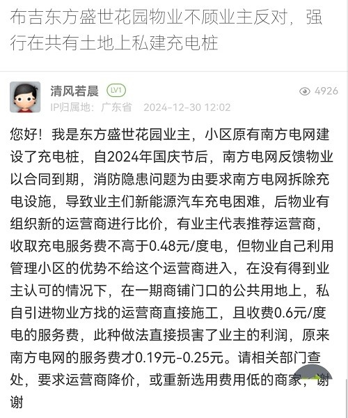 3. 帖文《布吉东方盛世花园物业不顾业主反对,强行在共有土地上私建充电桩》