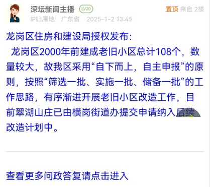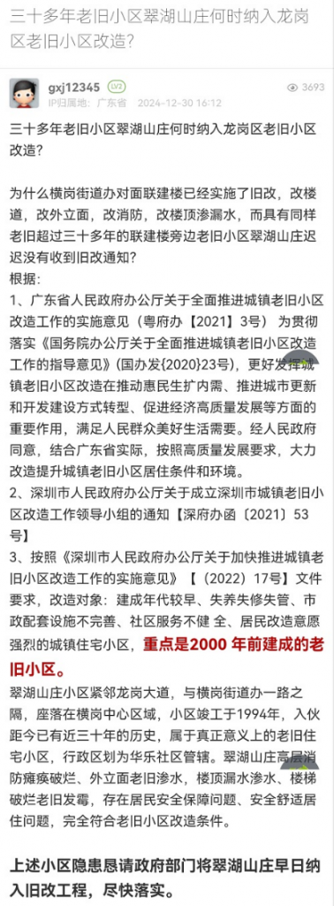 6. 帖文《三十多年老旧小区翠湖山庄何时纳入龙岗区老旧小区改造?》