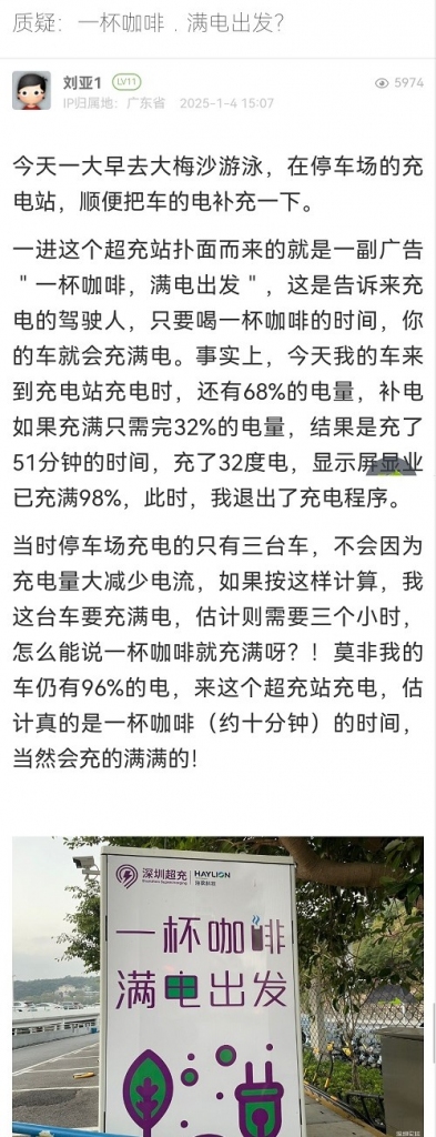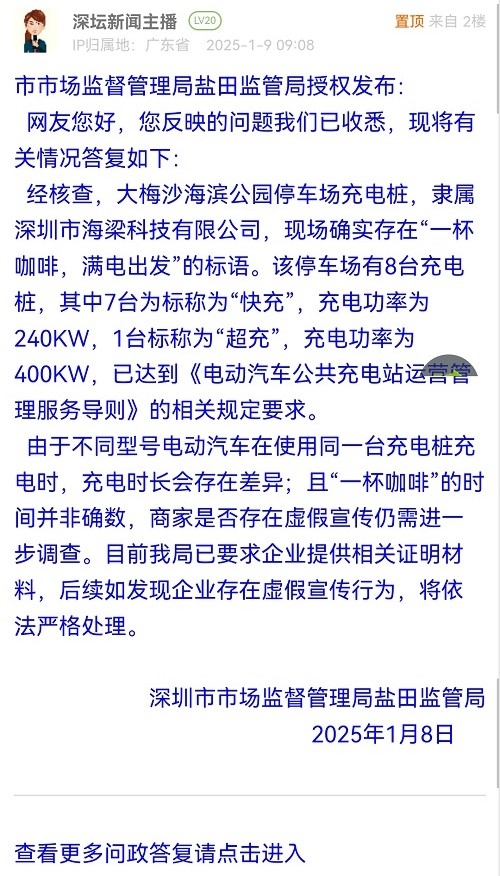 经核查,大梅沙海滨公园停车场充电桩,隶属深圳市海梁科技有限公司,现场确实存在“一杯咖啡,满电出发”的标语。该停车场有8台充电桩,其中7台为标称为“快充”,充电功率为240KW,1台标称为“超充”,充电功率为400KW,已达到《电动汽车公共充电站运营管理服务导则》的相关规定要求。