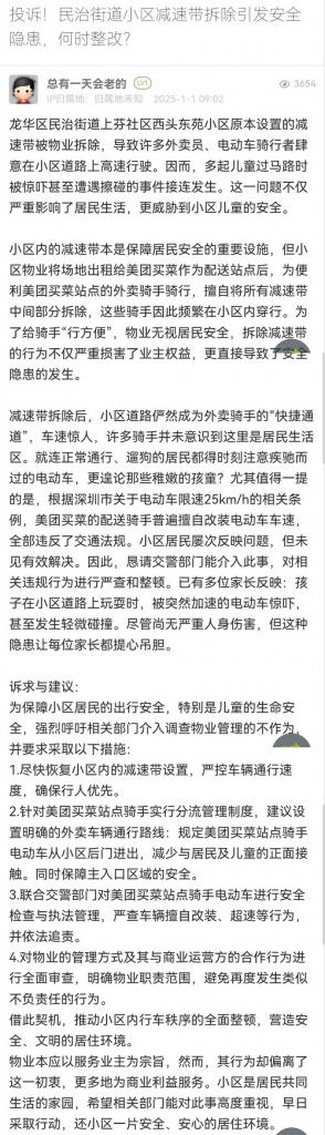 10. 帖文《投诉!民治街道小区减速带拆除引发安全隐患,何时整改?》