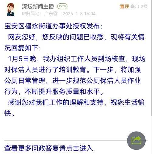 尊敬的网民朋友:您好,关于您在深圳论坛上反映的情况收悉。现将有关情况回复如下:
