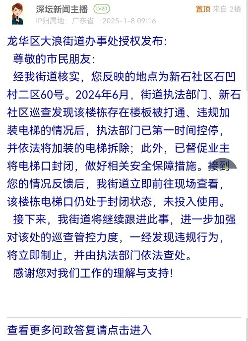 7. 帖文《大浪凯滨新村91栋电梯被强行关掉》
