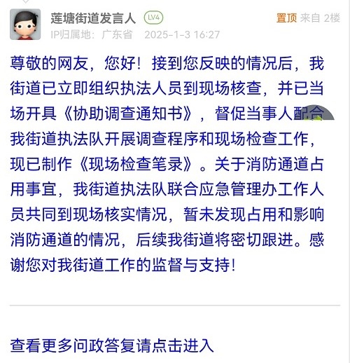 尊敬的网友,您好!接到您反映的情况后,我街道已立即组织执法人员到现场核查,并已当场开具《协助调查通知书》,督促当事人配合我街道执法队开展调查程序和现场检查工作,现已制作《现场检查笔录》。关于消防通道占用事宜,我街道执法队联合应急管理办工作人员共同到现场核实情况,暂未发现占用和影响消防通道的情况,后续我街道将密切跟进。感谢您对我街道工作的监督与支持!
