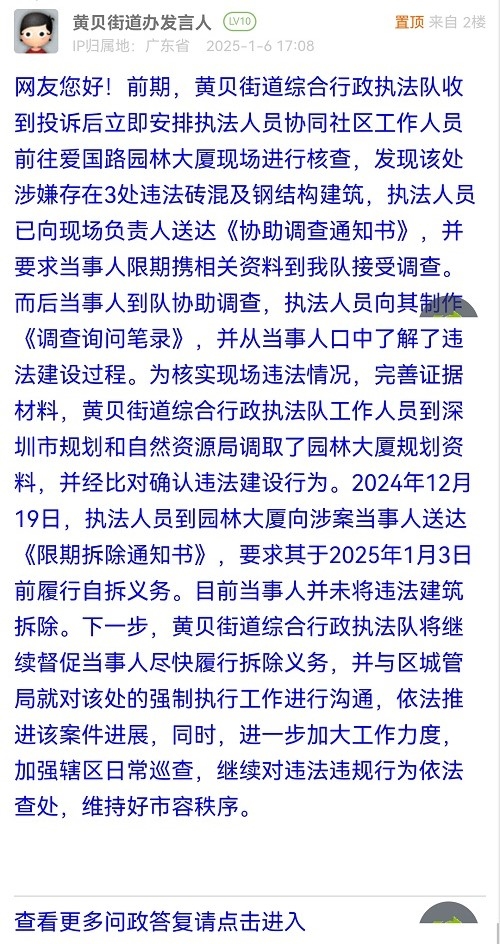 网友您好!前期,黄贝街道综合行政执法队收到投诉后立即安排执法人员协同社区工作人员前往爱国路园林大厦现场进行核查,发现该处涉嫌存在3处违法砖混及钢结构建筑,执法人员已向现场负责人送达《协助调查通知书》,并要求当事人限期携相关资料到我队接受调查。而后当事人到队协助调查,执法人员向其制作《调查询问笔录》,并从当事人口中了解了违法建设过程。为核实现场违法情况,完善证据材料,黄贝街道综合行政执法队工作人员到深圳市规划和自然资源局调取了园林大厦规划资料,并经比对确认违法建设行为。2024年12月19日,执法人员到园林大厦向涉案当事人送达《限期拆除通知书》,要求其于2025年1月3日前履行自拆义务。目前当事人并未将违法建筑拆除。下一步,黄贝街道综合行政执法队将继续督促当事人尽快履行拆除义务,并与区城管局就对该处的强制执行工作进行沟通,依法推进该案件进展,同时,进一步加大工作力度,加强辖区日常巡查,继续对违法违规行为依法查处,维持好市容秩序。