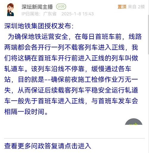 为确保地铁运营安全,在每日首班车前,线路两端都会各开行一列不载客列车进入正线,我们将这辆在首班车开行前进入正线的列车叫做轧道车。该列车沿线不停靠,缓慢通过各车站,目的就是--确保前夜施工检修作业万无一失,从而保证后续载客列车平稳安全运行轧道车一般先于首班车进入正线,与首班车发车会相隔一段时间。
