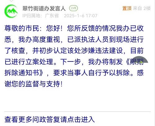 尊敬的市民:您好!您所反馈的情况我办已收悉,我办高度重视,已派执法人员到现场进行了核查,并初步认定该处涉嫌违法建设,目前已进行立案处理。下一步,我办将制发《限期拆除通知书》,要求当事人自行予以拆除。感谢您的监督与支持!