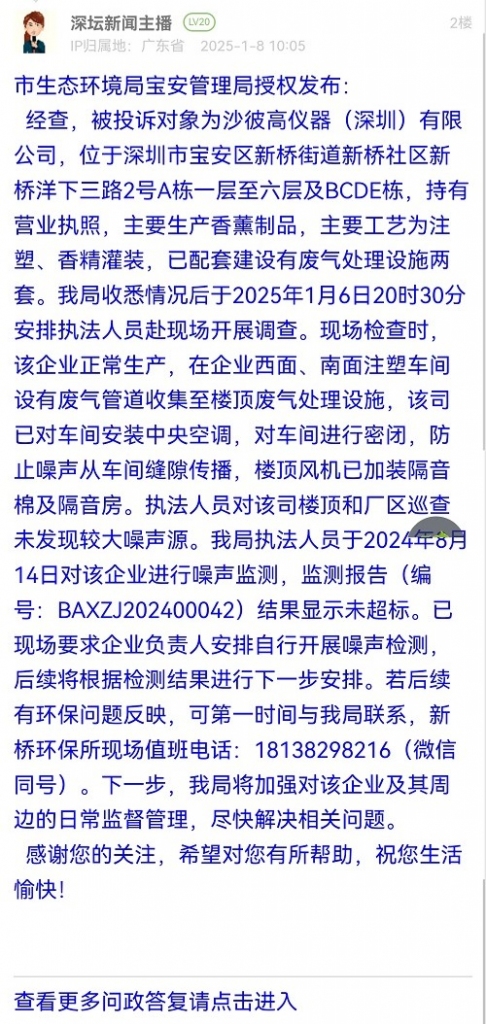 经查,被投诉对象为沙彼高仪器(深圳)有限公司,位于深圳市宝安区新桥街道新桥社区新桥洋下三路2号A栋一层至六层及BCDE栋,持有营业执照,主要生产香薰制品,主要工艺为注塑、香精灌装,已配套建设有废气处理设施两套。我局收悉情况后于2025年1月6日20时30分安排执法人员赴现场开展调查。现场检查时,该企业正常生产,在企业西面、南面注塑车间设有废气管道收集至楼顶废气处理设施,该司已对车间安装中央空调,对车间进行密闭,防止噪声从车间缝隙传播,楼顶风机已加装隔音棉及隔音房。执法人员对该司楼顶和厂区巡查未发现较大噪声源。我局执法人员于2024年8月14日对该企业进行噪声监测,监测报告(编号:BAXZJ202400042)结果显示未超标。已现场要求企业负责人安排自行开展噪声检测,后续将根据检测结果进行下一步安排。若后续有环保问题反映,可第一时间与我局联系,新桥环保所现场值班电话:18138298216(微信同号)。下一步,我局将加强对该企业及其周边的日常监督管理,尽快解决相关问题。