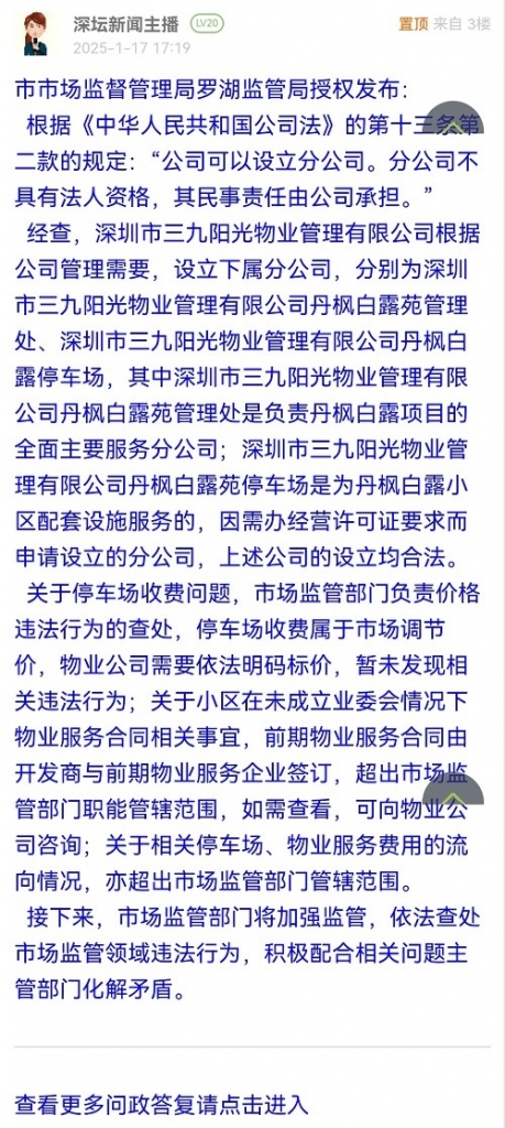 经查,深圳市三九阳光物业管理有限公司根据公司管理需要,设立下属分公司,分别为深圳市三九阳光物业管理有限公司丹枫白露苑管理处、深圳市三九阳光物业管理有限公司丹枫白露停车场,其中深圳市三九阳光物业管理有限公司丹枫白露苑管理处是负责丹枫白露项目的全面主要服务分公司;深圳市三九阳光物业管理有限公司丹枫白露苑停车场是为丹枫白露小区配套设施服务的,因需办经营许可证要求而申请设立的分公司,上述公司的设立均合法。