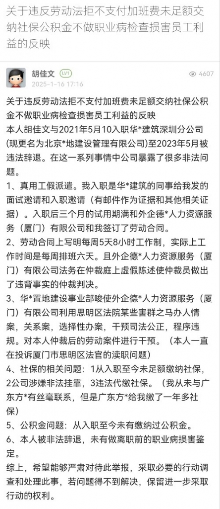 10. 帖文《关于违反劳动法拒不支付加班费未足额交纳社保公积金不做职业病检查损害员工利益的反映》