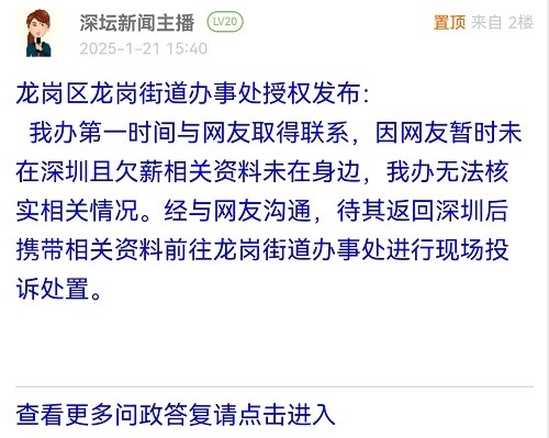 我办第一时间与网友取得联系,因网友暂时未在深圳且欠薪相关资料未在身边,我办无法核实相关情况。经与网友沟通,待其返回深圳后携带相关资料前往龙岗街道办事处进行现场投诉处置。