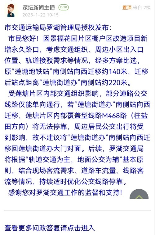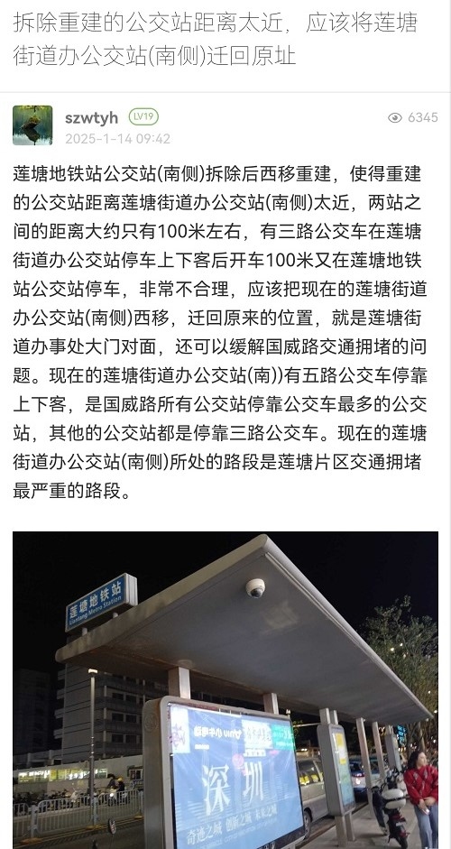 16. 帖文《拆除重建的公交站距离太近,应该将莲塘街道办公交站(南侧)迁回原址》