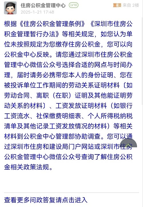 根据《住房公积金管理条例》《深圳市住房公积金管理暂行办法》等相关规定,如您认为单位未按照规定为您缴存住房公积金,您可以向公积金中心反映。请您通过深圳市住房公积金管理中心微信公众号选择合适的网点与时间办理,届时请务必携带您本人的身份证明、您在被投诉单位工作期间的劳动关系证明材料〔如劳动合同、离职(在职)证明及其他能证明劳动关系的材料〕、工资发放证明材料(如银行工资流水、社保缴费明细表、个人所得税纳税清单及其他记录工资发放情况的材料)等相关材料到公积金中心管理部协助调查。您可以通过深圳市住房和建设局门户网站或深圳市住房公积金管理中心微信公众号查询了解住房公积金相关政策法规。