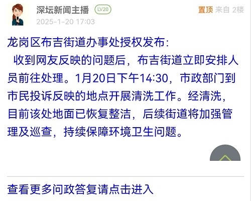 收到网友反映的问题后,布吉街道立即安排人员前往处理。1月20日下午14:30,市政部门到市民投诉反映的地点开展清洗工作。经清洗,目前该处地面已恢复整洁,后续街道将加强管理及巡查,持续保障环境卫生问题。
