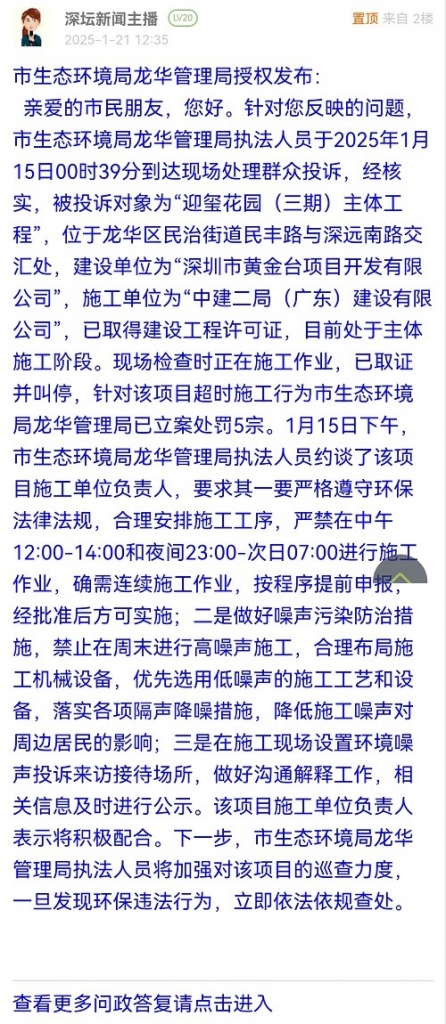亲爱的市民朋友,您好。针对您反映的问题,市生态环境局龙华管理局执法人员于2025年1月15日00时39分到达现场处理群众投诉,经核实,被投诉对象为“迎玺花园(三期)主体工程”,位于龙华区民治街道民丰路与深远南路交汇处,建设单位为“深圳市黄金台项目开发有限公司”,施工单位为“中建二局(广东)建设有限公司”,已取得建设工程许可证,目前处于主体施工阶段。现场检查时正在施工作业,已取证并叫停,针对该项目超时施工行为市生态环境局龙华管理局已立案处罚5宗。1月15日下午,市生态环境局龙华管理局执法人员约谈了该项目施工单位负责人,要求其一要严格遵守环保法律法规,合理安排施工工序,严禁在中午12:00-14:00和夜间23:00-次日07:00进行施工作业,确需连续施工作业,按程序提前申报,经批准后方可实施;二是做好噪声污染防治措施,禁止在周末进行高噪声施工,合理布局施工机械设备,优先选用低噪声的施工工艺和设备,落实各项隔声降噪措施,降低施工噪声对周边居民的影响;三是在施工现场设置环境噪声投诉来访接待场所,做好沟通解释工作,相关信息及时进行公示。该项目施工单位负责人表示将积极配合。下一步,市生态环境局龙华管理局执法人员将加强对该项目的巡查力度,一旦发现环保违法行为,立即依法依规查处。