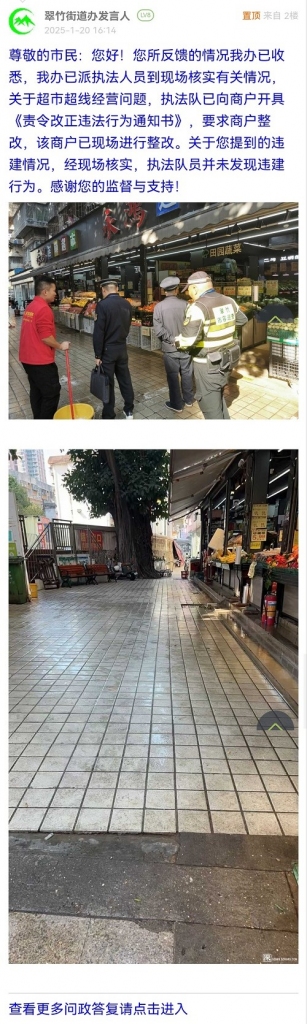 尊敬的市民:您好!您所反馈的情况我办已收悉,我办已派执法人员到现场核实有关情况,关于超市超线经营问题,执法队已向商户开具《责令改正违法行为通知书》,要求商户整改,该商户已现场进行整改。关于您提到的违建情况,经现场核实,执法队员并未发现违建行为。感谢您的监督与支持!