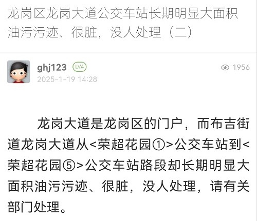 15. 帖文《龙岗区龙岗大道公交车站长期明显大面积油污污迹、很脏,没人处理(二)》
