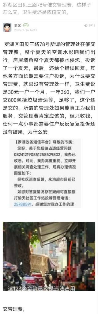 9. 帖文《罗湖区田贝三路78号催交管理费,这样子怎么交,卫生费还是应该交的。》