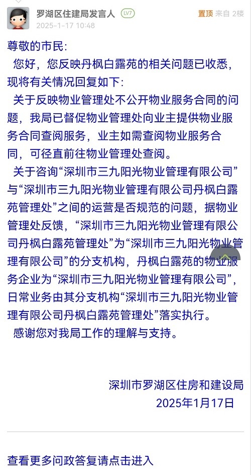 关于咨询“深圳市三九阳光物业管理有限公司”与“深圳市三九阳光物业管理有限公司丹枫白露苑管理处”之间的运营是否规范的问题,据物业管理处反馈,“深圳市三九阳光物业管理有限公司丹枫白露苑管理处”为“深圳市三九阳光物业管理有限公司”的分支机构,丹枫白露苑的物业服务企业为“深圳市三九阳光物业管理有限公司”,日常业务由其分支机构“深圳市三九阳光物业管理有限公司丹枫白露苑管理处”落实执行。感谢您对我局工作的理解与支持。