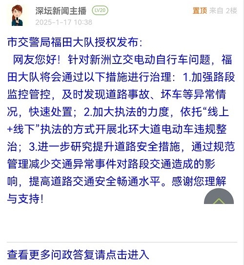 各职能单位如需对网友反映的问题进行回应,可在深圳论坛注册官方账号并通过认证,回帖进行回应。
