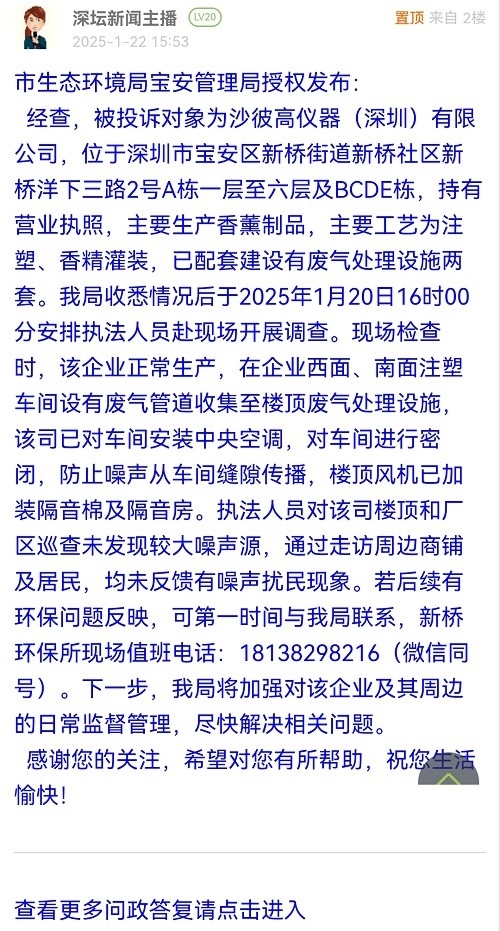 经查,被投诉对象为沙彼高仪器(深圳)有限公司,位于深圳市宝安区新桥街道新桥社区新桥洋下三路2号A栋一层至六层及BCDE栋,持有营业执照,主要生产香薰制品,主要工艺为注塑、香精灌装,已配套建设有废气处理设施两套。我局收悉情况后于2025年1月20日16时00分安排执法人员赴现场开展调查。现场检查时,该企业正常生产,在企业西面、南面注塑车间设有废气管道收集至楼顶废气处理设施,该司已对车间安装中央空调,对车间进行密闭,防止噪声从车间缝隙传播,楼顶风机已加装隔音棉及隔音房。执法人员对该司楼顶和厂区巡查未发现较大噪声源,通过走访周边商铺及居民,均未反馈有噪声扰民现象。若后续有环保问题反映,可第一时间与我局联系,新桥环保所现场值班电话:18138298216(微信同号)。下一步,我局将加强对该企业及其周边的日常监督管理,尽快解决相关问题。感谢您的关注,希望对您有所帮助,祝您生活愉快!