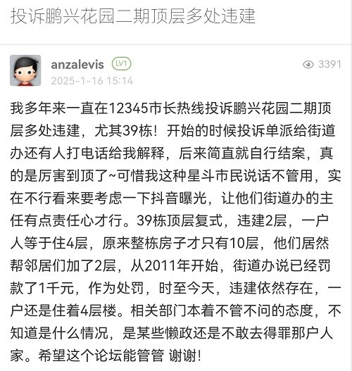 5. 帖文《投诉鹏兴花园二期顶层多处违建》
