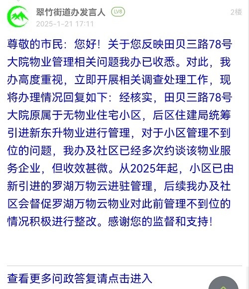 尊敬的市民:您好!关于您反映田贝三路78号大院物业管理相关问题我办已收悉。对此,我办高度重视,立即开展相关调查处理工作,现将办理情况回复如下:经核实,田贝三路78号大院原属于无物业住宅小区,后区住建局统筹引进新东升物业进行管理,对于小区管理不到位的问题,我办及社区已经多次约谈该物业服务企业,但收效甚微。从2025年起,小区已由新引进的罗湖万物云进驻管理,后续我办及社区会督促罗湖万物云物业对此前管理不到位的情况积极进行整改。感谢您的监督和支持!
