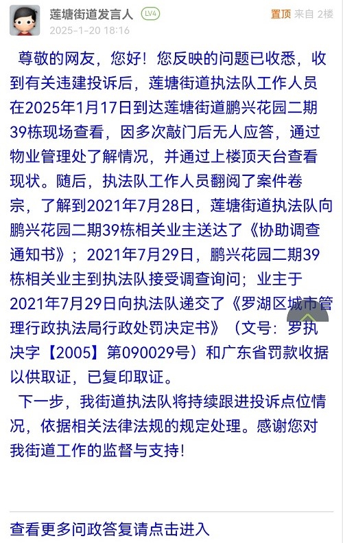 尊敬的网友,您好!您反映的问题已收悉,收到有关违建投诉后,莲塘街道执法队工作人员在2025年1月17日到达莲塘街道鹏兴花园二期39栋现场查看,因多次敲门后无人应答,通过物业管理处了解情况,并通过上楼顶天台查看现状。随后,执法队工作人员翻阅了案件卷宗,了解到2021年7月28日,莲塘街道执法队向鹏兴花园二期39栋相关业主送达了《协助调查通知书》;2021年7月29日,鹏兴花园二期39栋相关业主到执法队接受调查询问;业主于2021年7月29日向执法队递交了《罗湖区城市管理行政执法局行政处罚决定书》(文号:罗执决字【2005】第090029号)和广东省罚款收据以供取证,已复印取证。