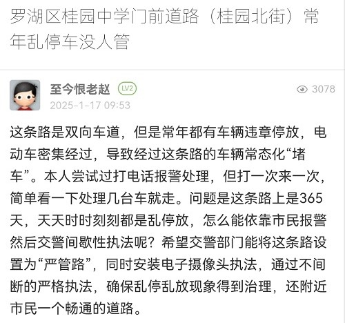 12. 帖文《罗湖区桂园中学门前道路(桂园北街)常年乱停车没人管》