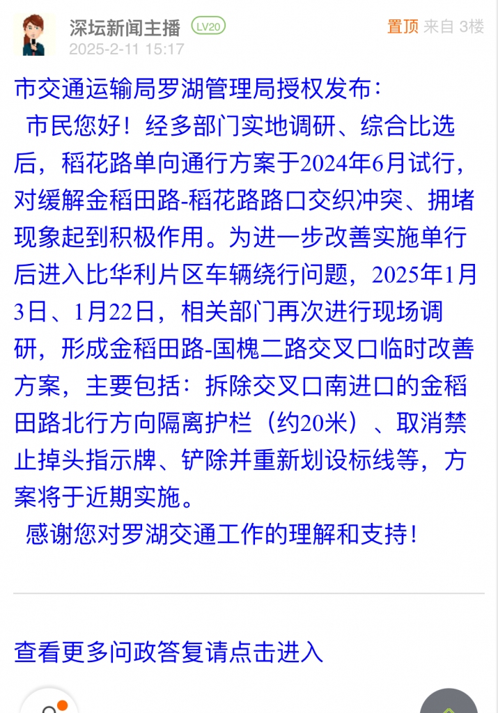 市民您好!经多部门实地调研、综合比选后,稻花路单向通行方案于2024年6月试行,对缓解金稻田路-稻花路路口交织冲突、拥堵现象起到积极作用。为进一步改善实施单行后进入比华利片区车辆绕行问题,2025年1月3日、1月22日,相关部门再次进行现场调研,形成金稻田路-国槐二路交叉口临时改善方案,主要包括:拆除交叉口南进口的金稻田路北行方向隔离护栏(约20米)、取消禁止掉头指示牌、铲除并重新划设标线等,方案将于近期实施。感谢您对罗湖交通工作的理解和支持!
