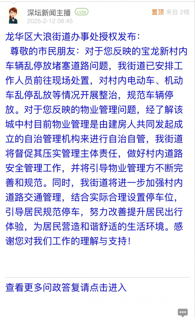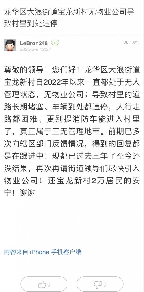 6. 帖文《龙华区大浪街道宝龙新村无物业公司导致村里到处违停》