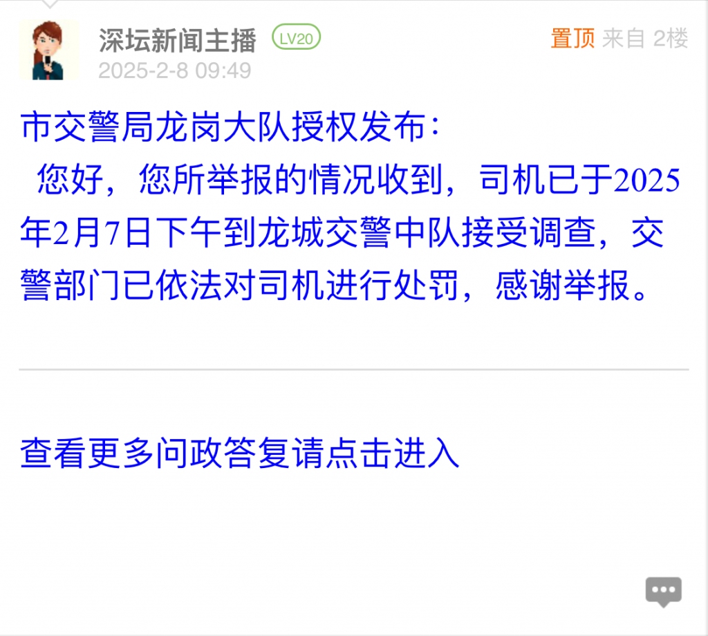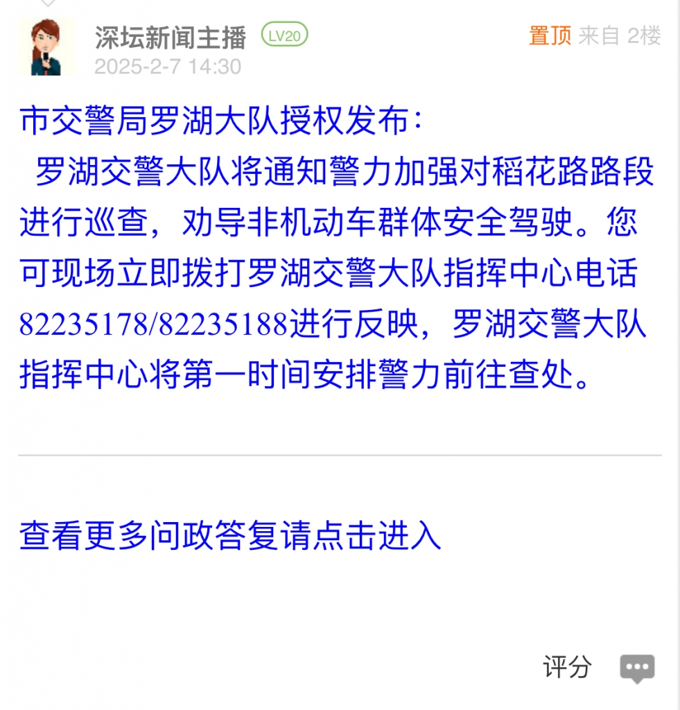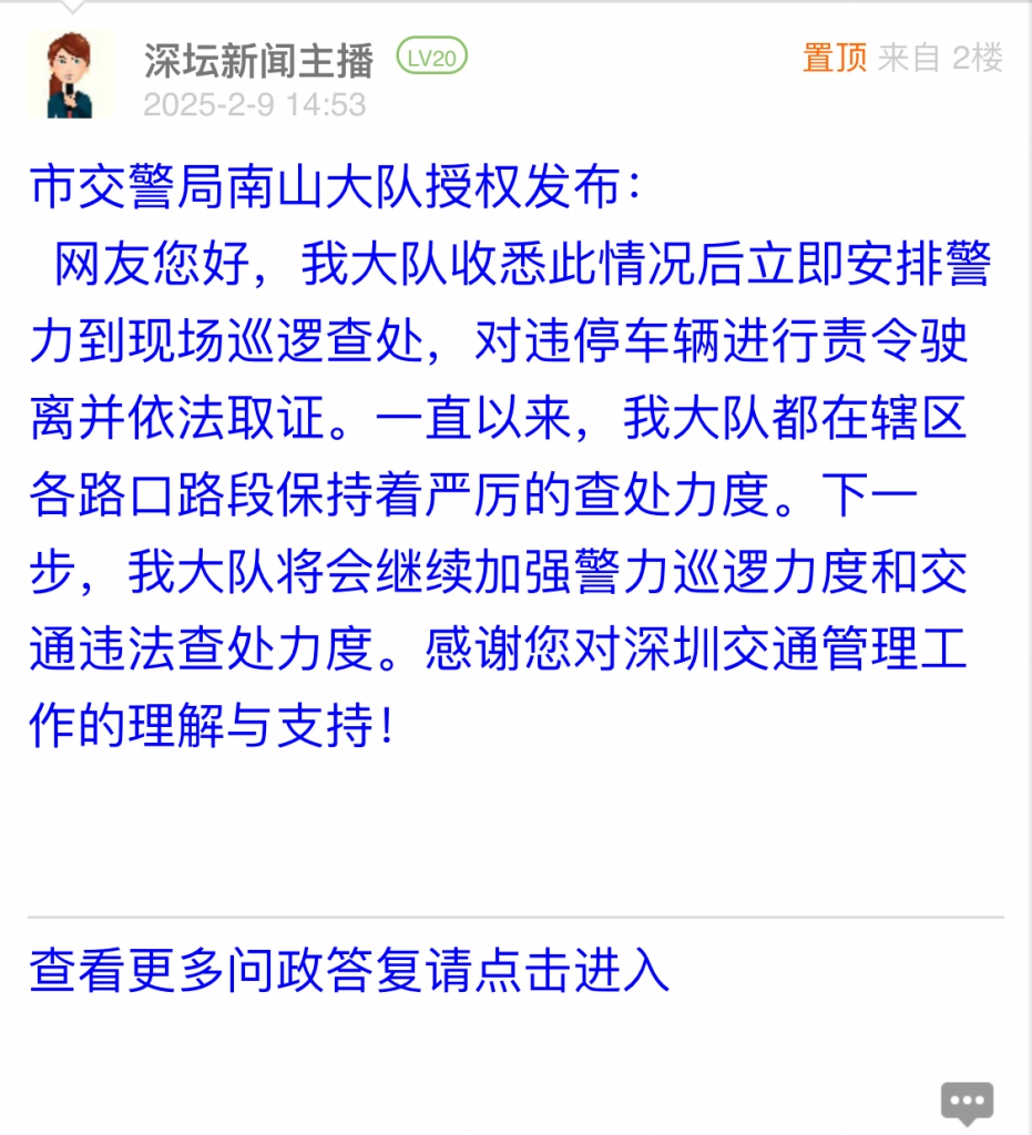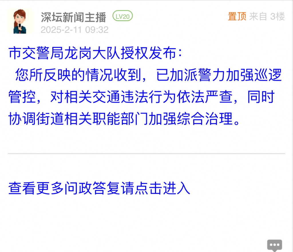 据统计,2025年2月3日-2025年2月9日,网友在深圳论坛发布问政类帖文共18篇,得到相关单位正式回应的帖文数为12篇,本期简报回应速度最快的单位:市交警局南山大队、市交警局龙岗大队。