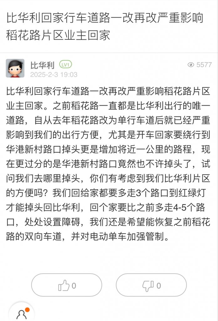 1. 帖文《比华利回家行车道路一改再改严重影响稻花路片区业主回家》