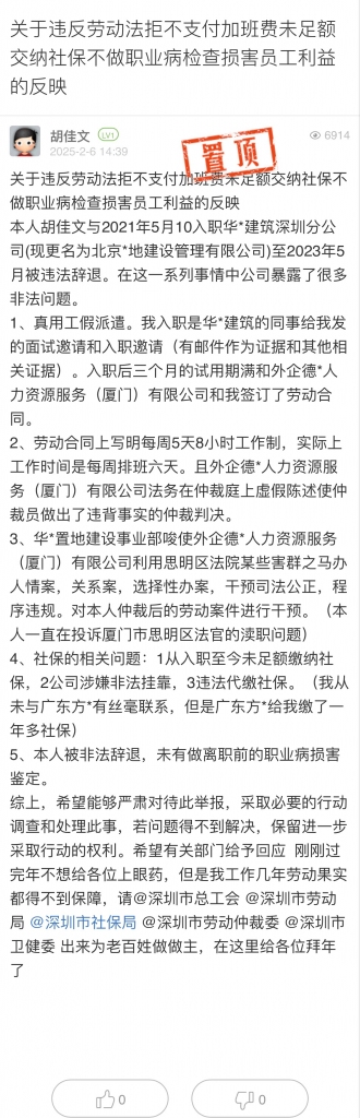 3. 帖文《关于违反劳动法拒不支付加班费未足额交纳社保不做职业病检查损害员工利益的反映》