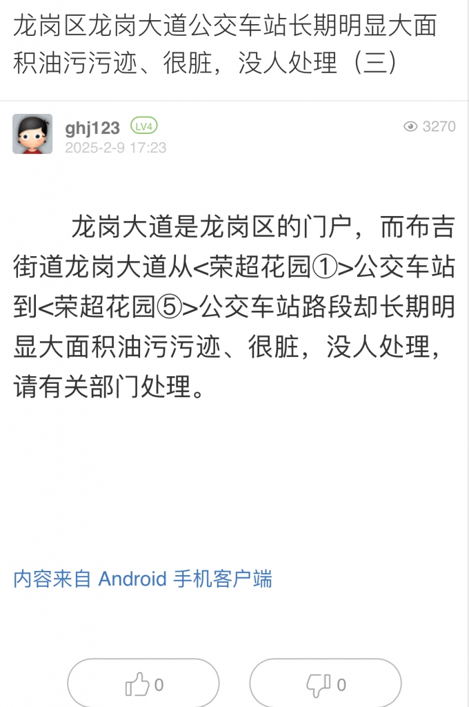 8. 帖文《龙岗区龙岗大道公交车站长期明显大面积油污污迹、很脏,没人处理(三)》