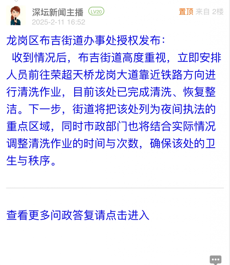 收到情况后,布吉街道高度重视,立即安排人员前往荣超天桥龙岗大道靠近铁路方向进行清洗作业,目前该处已完成清洗、恢复整洁。下一步,街道将把该处列为夜间执法的重点区域,同时市政部门也将结合实际情况调整清洗作业的时间与次数,确保该处的卫生与秩序。